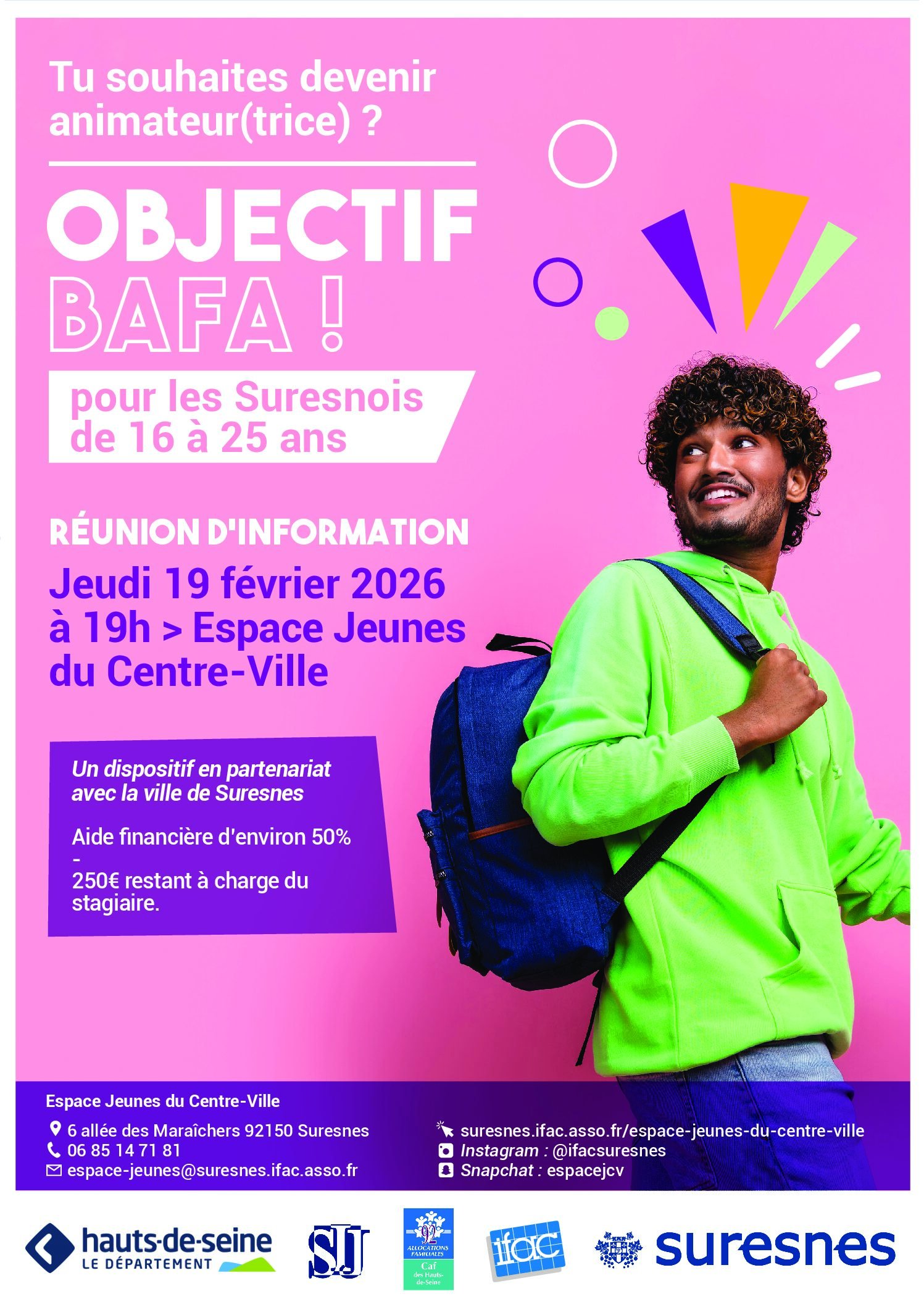 Tu souhaites devenir animateur ? IFAC Suresnes organise la première étape du BAFA Pour tout renseignement ou pour t’inscrire, adresse -toi Espace Jeunes du Centre-Ville N’hésite pas à venir te renseigner pour te lancer dans l’aventure !